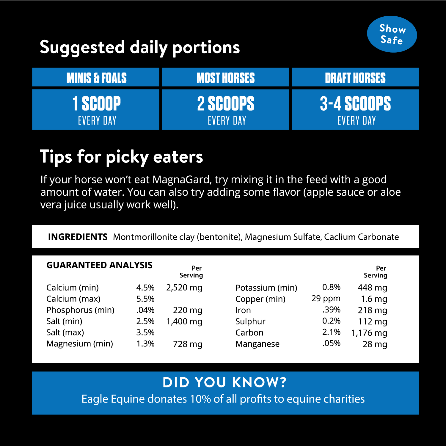 Feed 2 scoops daily (2 oz) in either AM or PM feed. May also be fed 4 hours before event as a calming support and gastric buffer.