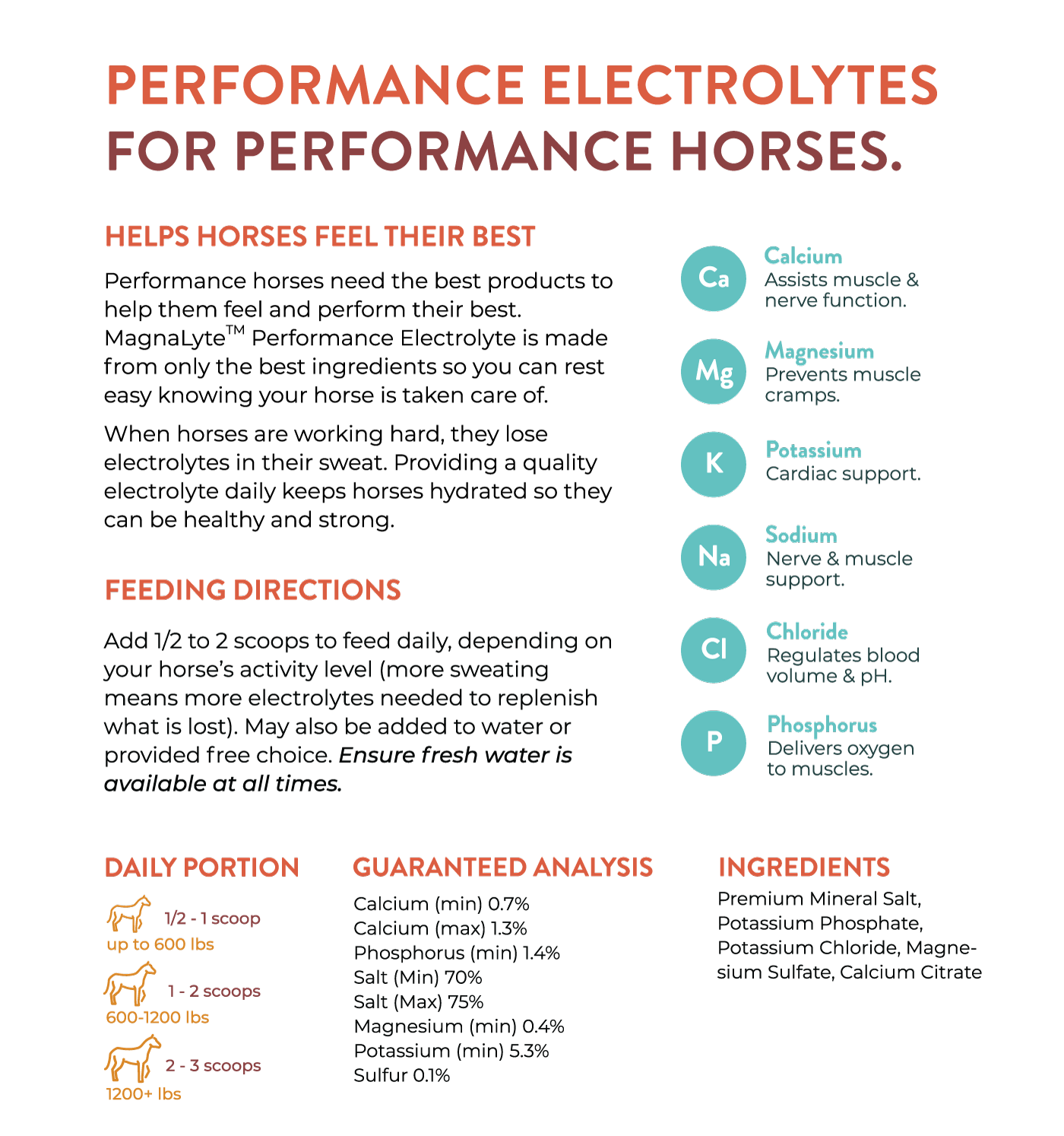 MagnaLyte Performance Electrolytes (4 lb) replenishes the minerals horses lose through sweat—sodium, chloride, potassium, magnesium, and calcium—without the fillers or sugar found in many electrolytes. It supports proper hydration, muscle function, and faster recovery during hot weather, heavy training, or long rides.
