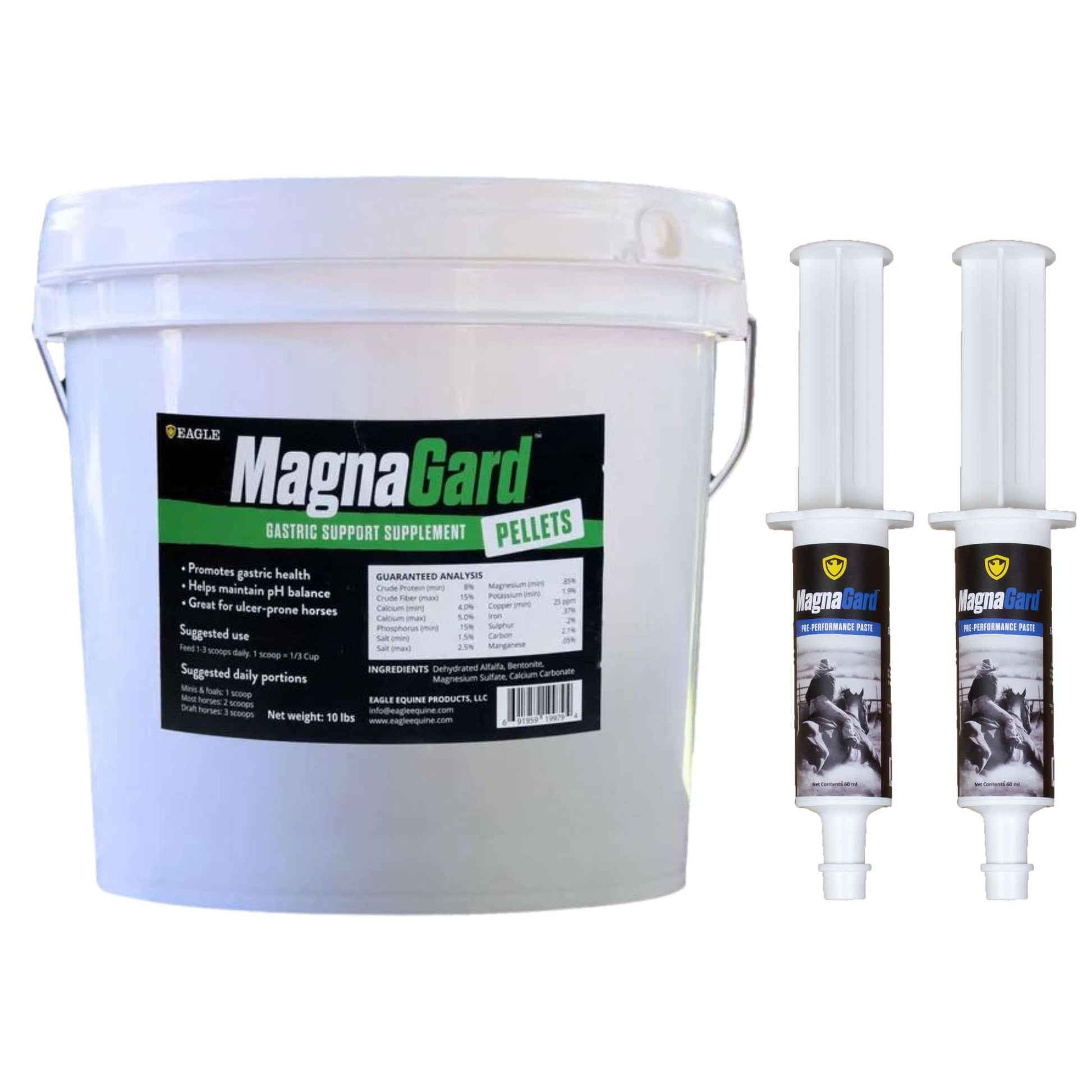 Includes: 10 lb bucket of MagnaGard Pellets (30-Day supply) and two tubes of MagnaGard Pre-Performance Paste (each tube is a single use).