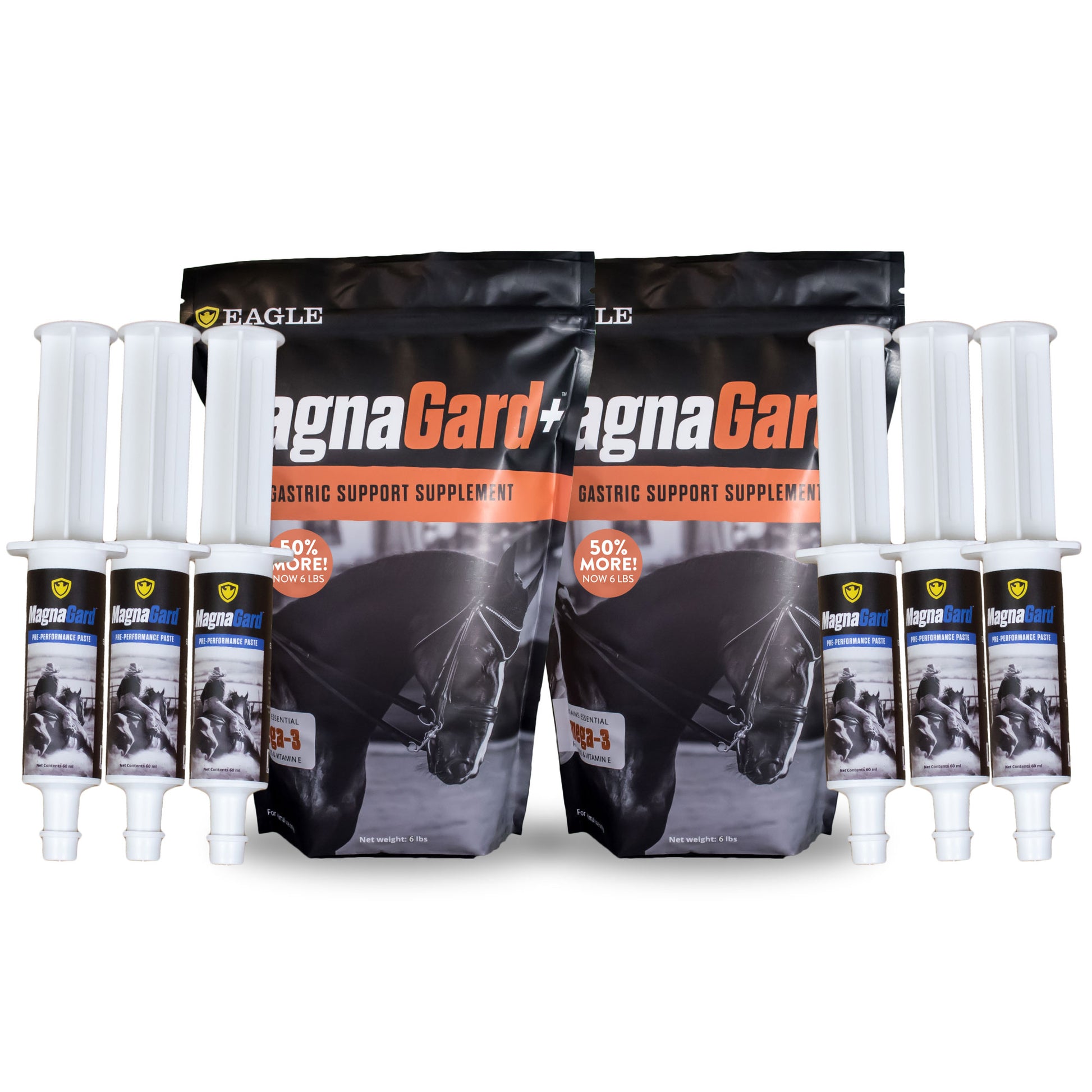 Two 6lb bags of MagnaGard PLUS (90 day supply) and six tubes of MagnaGard Pre-Performance Paste.